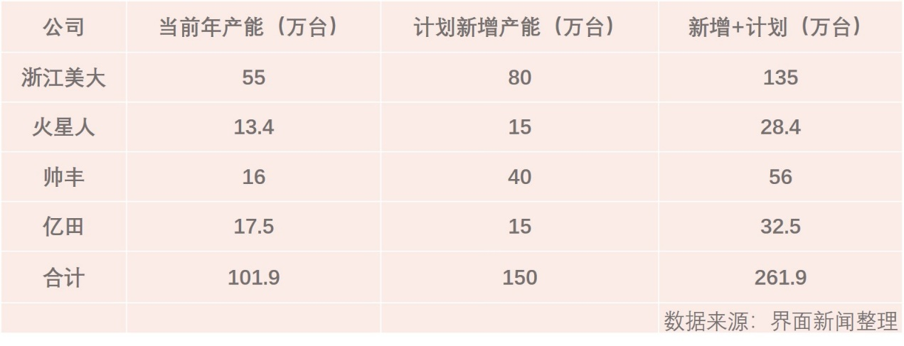 翻看这些集成灶企业的招股书,基本都提出了雄心勃勃的扩产计划。仅浙江美大(002677.SZ)、火星人、帅丰、亿田四家企业,计划新增集成灶产能就将达到150万台。