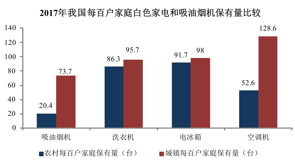一是,厨电在我国主要家电品类中,渗透率依然是偏低的,2017年我国百户家庭中,油烟机的保有量在农村和城镇分别为20.4台和73.7台,明显低于洗衣机、电冰箱、空调。这固然和居民的生活习惯有关,毕竟一台几十元的排风扇也能起到排烟作用,如果这些排风扇能升级成油烟机,当然意味着很大的市场潜力。