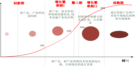 新产品渗透的S型曲线大致上分为三个阶段:创新期、成长期及成熟期。新技术、新产品在渗透率达到10%之前称为创新期,渗透率介乎10%至90%之间为成长期,渗透率90%之后称为成熟期。渗透率在超越10%之前会有很多的反复,新技术、新产品甚至因此被淘汰。而一旦突破10%的阻力位,会快速达到50%的水平,美国汽车渗透率由10%升至50%,只用了7年,这一时期是新技术、新产品的黄金时间。