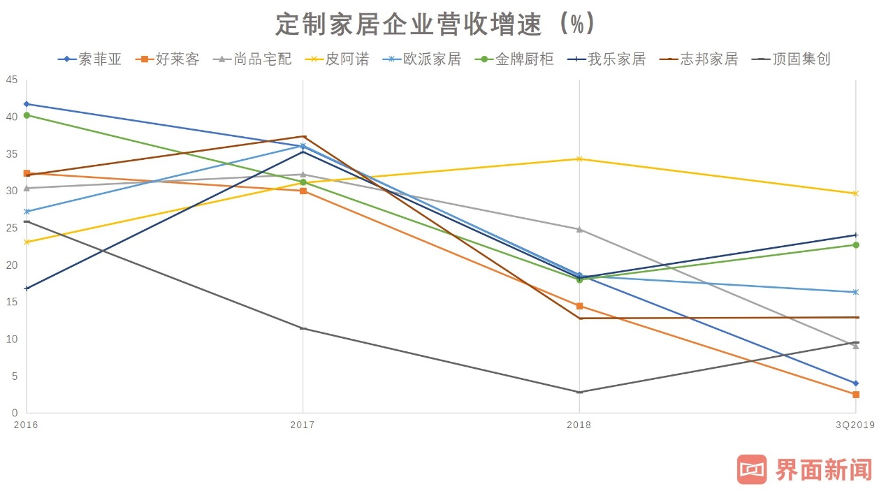 从定制家居企业营收增速来看,2017年正是最高点。选取9家A股定制家居,其2016年至2019年三季度营收增长的中位数分别为30.4%、32.2%、18.3%和12.9%。其中,索菲亚营收增速从2016年的42%,一路下降到2019年的个位数增长。