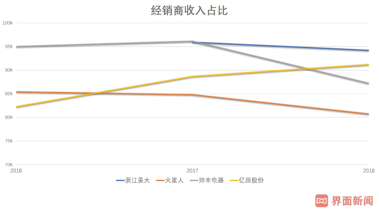 结合经销商收入占比,更能反映各公司产品的溢价能力。一般来说,经销商比例高会使毛利率偏低。截至2018年底,经销商比例最高的是浙江美大,而其毛利率反而较高,说明浙江美大有明显超越其他公司的溢价能力,而火星人比较重视在线直营销售,经销商收入比例最低,可以解释其较高的毛利率。