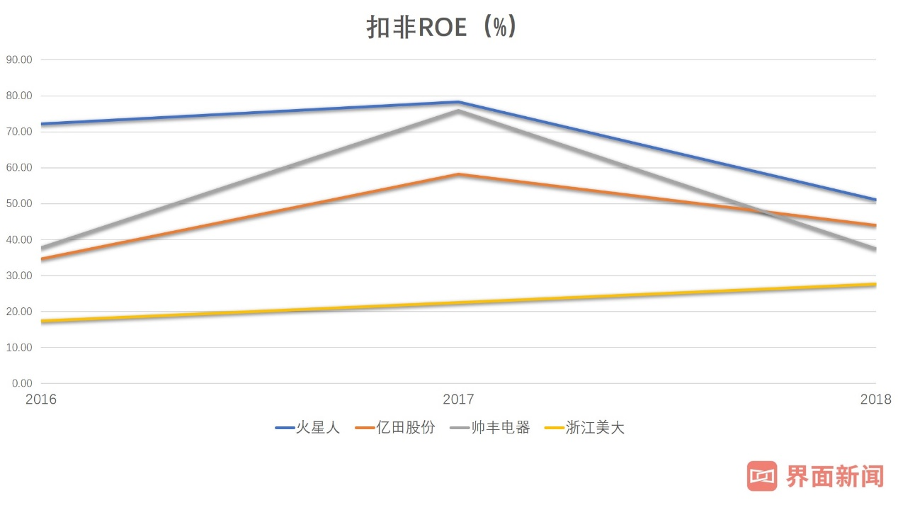 从毛利率看,除2018年外,浙江美大的毛利率都处于领先水平,火星人略高于帅丰,亿田则明显落后。
