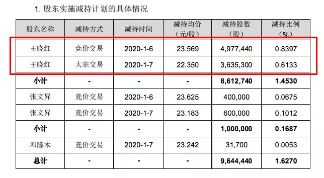其中,在1月6日-7日两个交易日期间,王晓红合计减持861.27万股,经计算合计套现金额达1.99亿元。