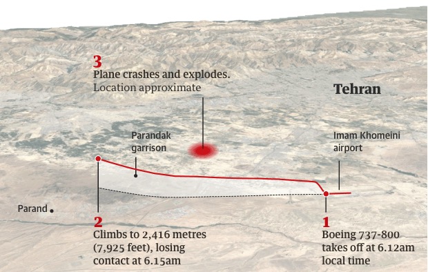 据《纽约时报》报道,视频中的强光是导弹击中飞机时出现的小型爆炸,但飞机并没有即刻爆炸,而是在继续飞行了几分钟后,调转方向飞回机场,随后坠毁。事件发生在乌航客机起飞的德黑兰霍梅尼国际机场附近的帕兰德县上空。