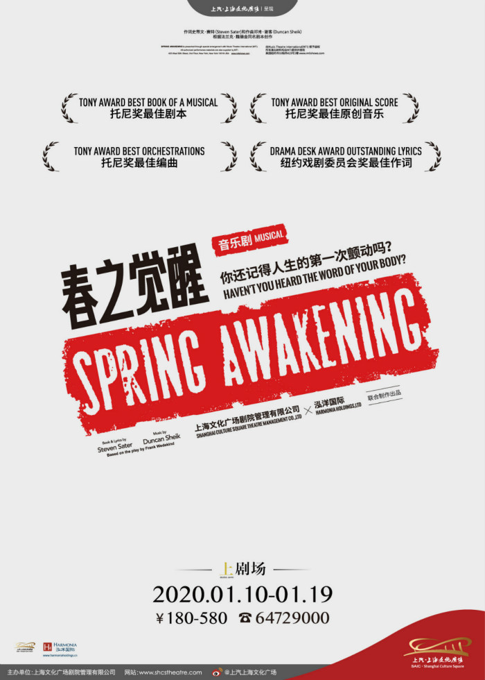 2016年,中文版音乐剧《春之觉醒》成功上演,那是上海文化广场剧院管理公司首次尝试音乐剧的整剧制作。2020年,新版《春之觉醒》回归剧场。在这四年的时间里,中国音乐剧市场经历了翻天覆地的变化,该剧的复排很大程度上也是中国音乐剧人的经验日益成熟的结果。2019年,上海文广远赴纽约百老汇选角,据了解,新版《春之觉醒》汇聚了美国百老汇、伦敦西区和中国的一流主创团队。