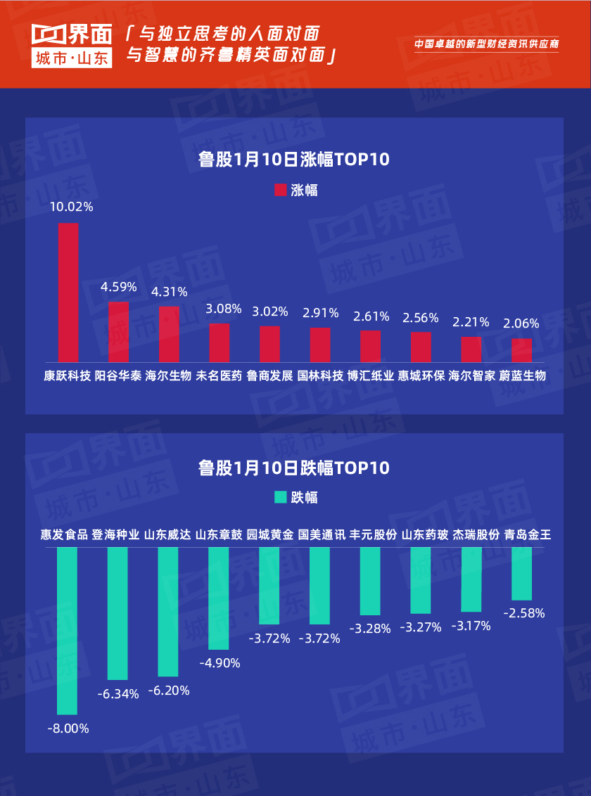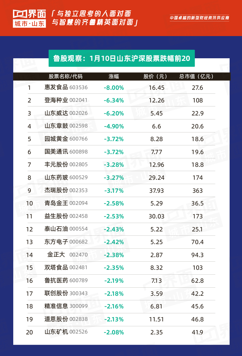 1月10日,山东省内沪深股票有68只个股上涨,133只下跌,8只与上一个交易日收盘价持平;