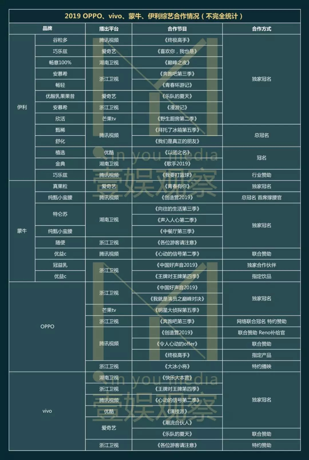 四个品牌在赞助策略上大同小异。头部和综N代在它们赞助的项目中占据绝对比例,同时连续赞助几季同一档节目也成为它们的常态。