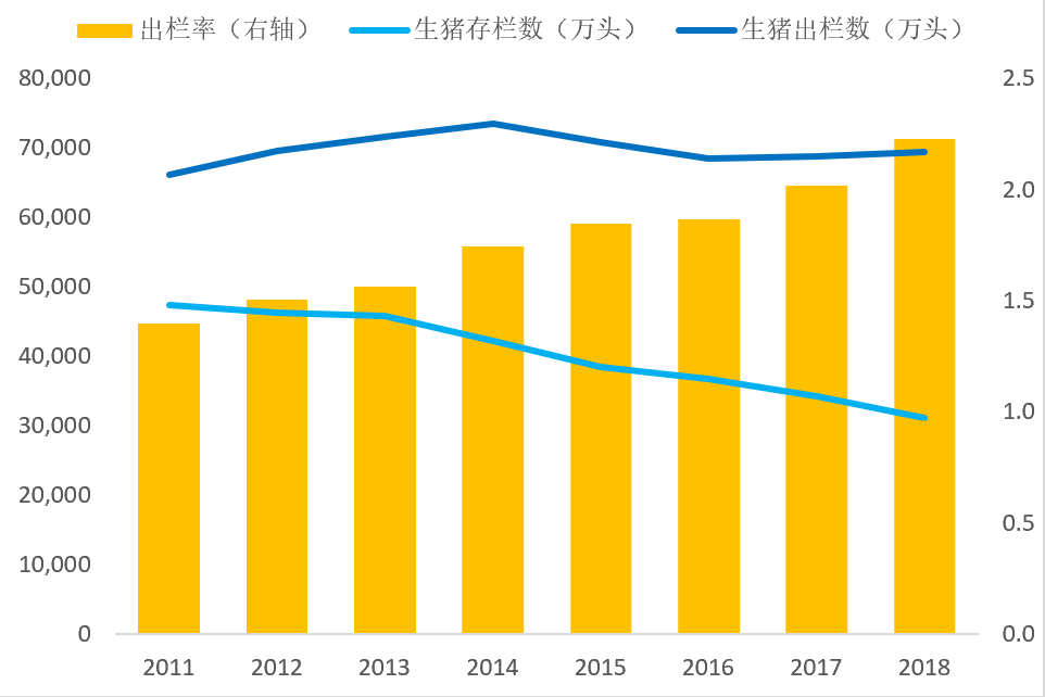 图4:规模化养殖提高了出栏率,2011年到2018年,尽管生猪存栏量下降了34.2%,但出栏量反而增加