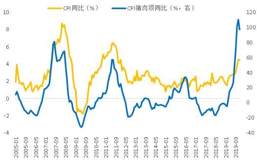 由于非洲猪瘟疫情扩散,生猪和能繁母猪剧烈淘汰,供需缺口扩大,2019年猪肉价格出现了一轮持续且大幅的上涨。22省市猪肉均价,从当年2月初的低点18.54元/千克,一路涨到10月下旬的高点56.02元/千克。猪肉如此迅速地涨价,引起了广泛关注,也带动CPI同比超预期上升,市场一度热议主要由猪肉涨价带动的CPI通胀是否会引起货币政策紧缩。