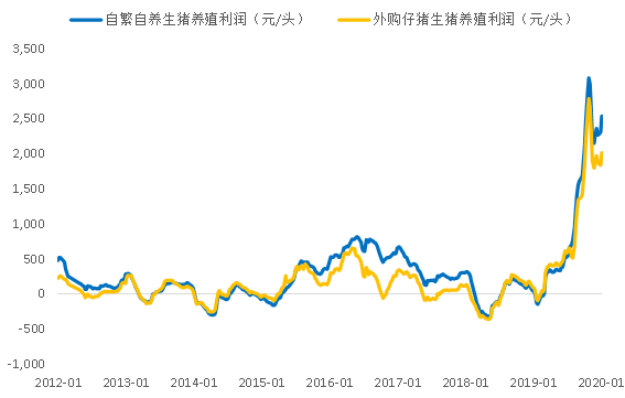这些数据意味着,在政策推动和高利润驱使下,养殖户的补栏意愿开始好转。仔猪从补栏到出栏,大约需要5个月的时间,2019年11月补栏的仔猪,将在2020年4月左右出栏。