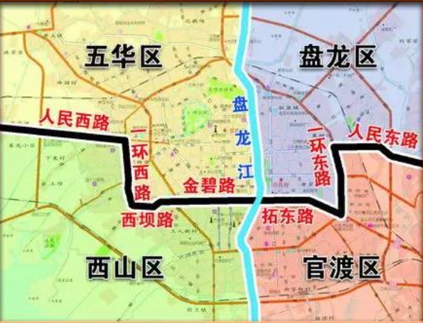 48年后的2004年,随着城市的建设发展,城市规模急剧扩大,昆明市的建成区面积达到近2000平方公里。当年7月22日,昆明迎来了第二次行政区划调整。调整后的昆明四区形成了以盘龙江、金碧路为轴线形成的一个“十”字结构切块。“区划调整后,昆明似乎没有了以前五华区、盘龙区才是城市,官渡区、西山区更像郊区的概念”,当时一位市民说。