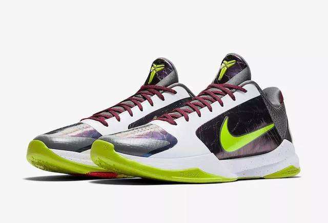在LeBron 7 “Christmas”版本复刻回归之后,科比曾上脚的Zoom Kobe V Protro “Chaos”小丑配色复刻发售。鞋款荧光绿色以及渐变紫色的运用很应景。