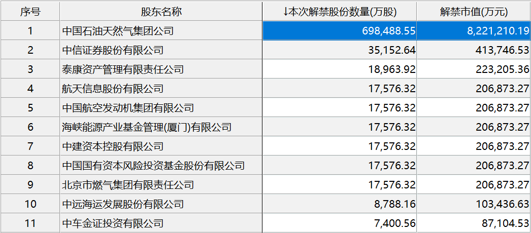 中石油集团所持股份占此次解禁的比例近八成,这部分解禁暂不必担忧,然而剩余二成的解禁威力仍不可小觑。