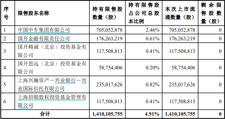 根据中国中车的公告,公司在1月17日将有14.11亿股限售股解禁,占公司总股本的比例为4.91%,约合解禁市值100.40亿元。这是公司三年前定增发行的股份。