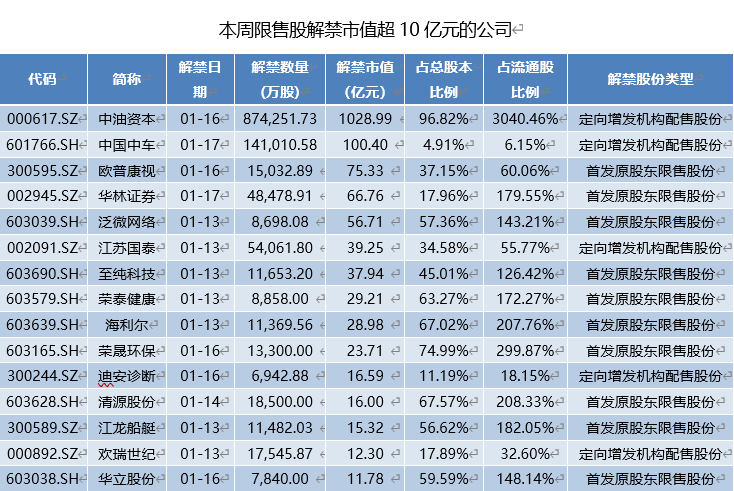解禁市值超过10亿元的上市公司合计有15家,除中油资本外,中国中车解禁市值也超过100亿元,此外,还有欧普康视(300595.SZ)、华林证券(002945.SZ)、泛微网络(603039.SH)三家公司解禁市值超过50亿元。