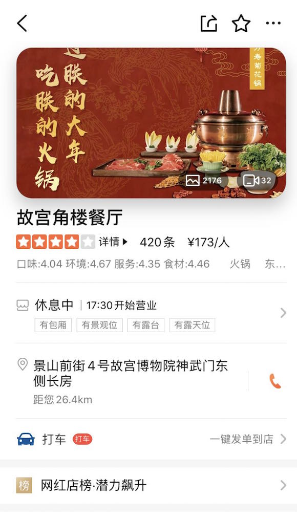 界面新闻从故宫角楼餐厅了解到,其年夜饭按每桌十人、收费6688元的标准设置,每增加一位加收680元,每桌最多12人。目前元宵节前已全部订满,还想预定的消费者只能先电话“挂号”,餐厅晚些统计过预订人数后,如果能排到,会再回电确定具体预约时间。