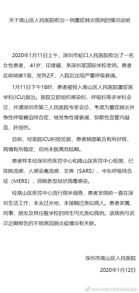 深圳市南山区人民医院通报,2020年1月11日上午,深圳市蛇口人民医院收治了一名女性患者,41岁,印度籍,系深圳某国际学校老师。患者此前咳嗽1周,发热2天,入院后出现严重呼吸衰竭。1月11日下午16时,患者被转入南山区人民医院重症医学科(ICU)救治……
