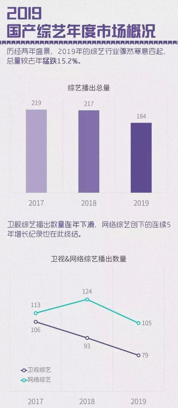 首当其冲的,便是综艺市场整体产量的缩小——《2019腾讯娱乐白皮书·综艺篇》显示,2019年各平台(台网)共播出综艺184档,较2018年的217档、2017年的219档,出现了明显的下滑。