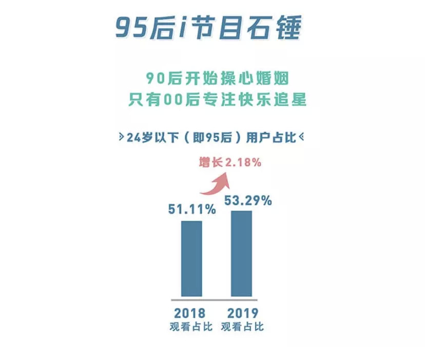 用户审美趋势的变化,和用户构成的变化有着密切关系。《年度指数报告》显示,在腾讯视频综艺频道中,24岁以下的“Z世代”用户占比,由2018年的51.11%攀升至2019年的53.29%,占比进一步提升。而在很多从业者看来,这批年轻用户群体表现出了强烈的表达欲与参与感,同时在内容喜好上比80后、90后更为垂直细分。