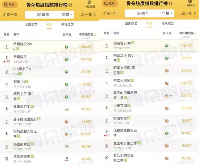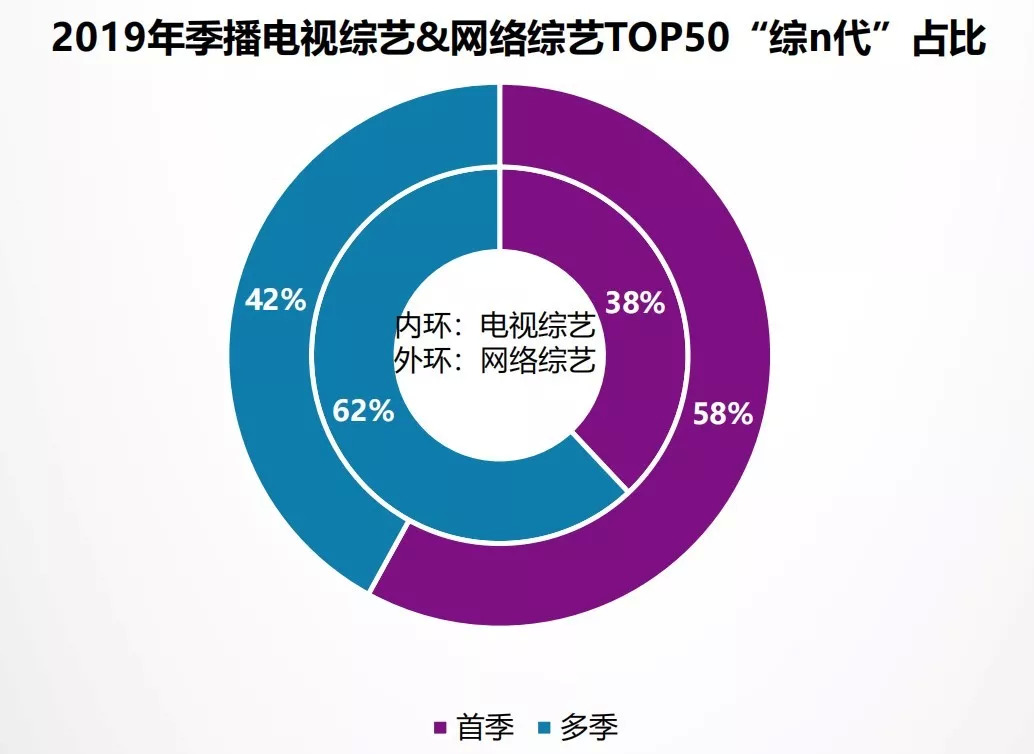 但如果从总体的创新能力上来比较,网综已然完成了对台综的全面超越:云合数据统计显示,2019年网络综艺共上新162部(含衍生综艺30部),电视综艺共上新93部;上述位列热度指数年榜TOP10的六部台综,均为“综N代”,并没有新节目;《2019艺恩文娱数据白皮书》也显示,2019年季播综艺TOP50中,台综的“综N代”占比远大于网综。