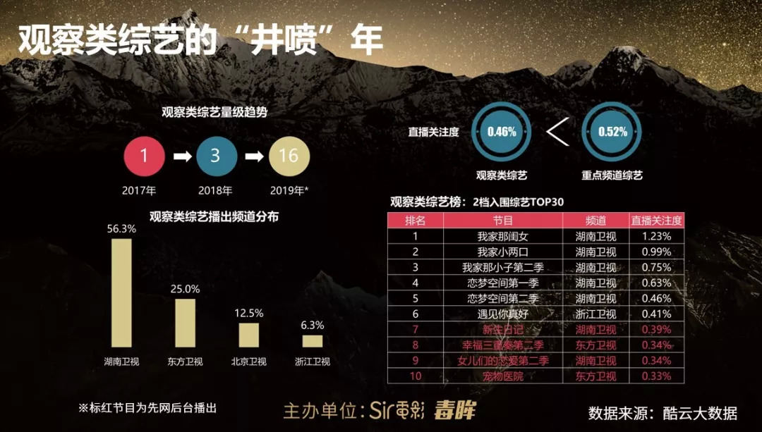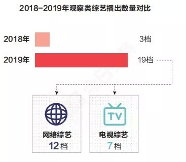 不过,偶像选秀热度的衰退,并不意味着2019年的综艺市场缺乏特色。毒眸观察发现,2019年综艺市场在题材上的最大亮点,是观察类综艺的“井喷”式出现。根据《2019今日头条白皮书》,观察类综艺从2018年的3档增长至2019年播出的19档,涨幅533%,成为新晋的热门类型。