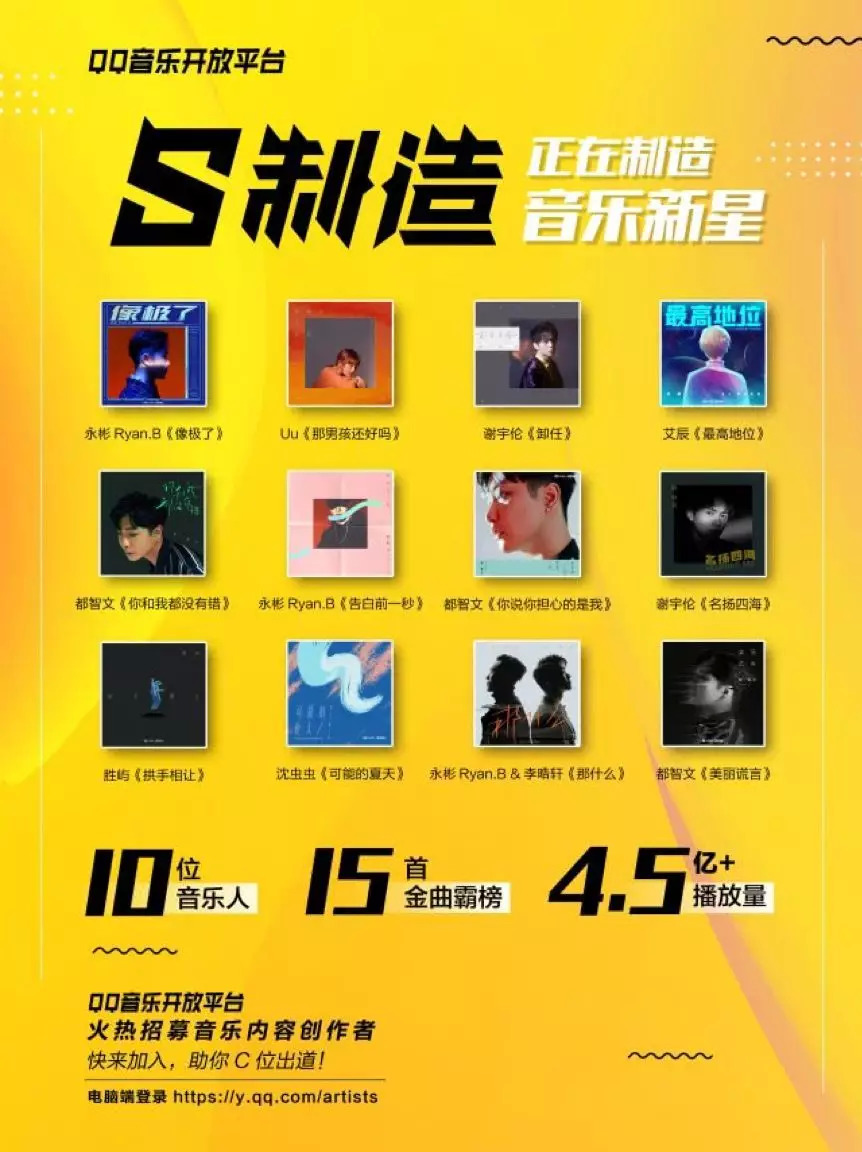 具体来看,比如QQ音乐开放平台就捧红了永彬Ryan.B数十位年轻音乐人,通过音乐征集大赛中的作品如《桥边姑娘》的海伦也一炮走红,其中的王牌宣发企划“S制造”,也是为了孵化更多的原创音乐人,如永彬Ryan.B、Uu、都智文、艾辰等创作者也产出了众多爆款歌曲。