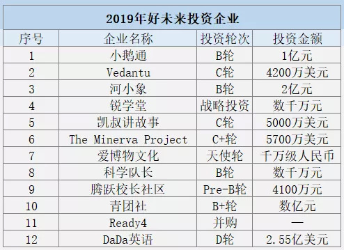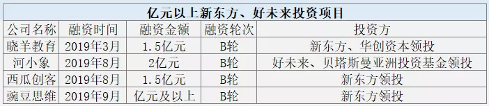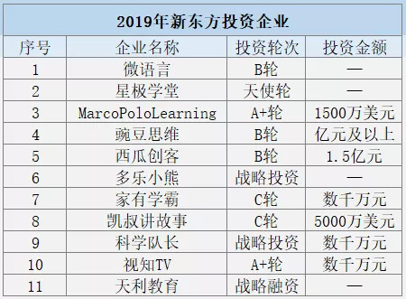 新东方、好未来是教育行业中不得不提及的领头雁。除了自身从事教育外,2019年融资过亿的企业背后也有它们的身影。