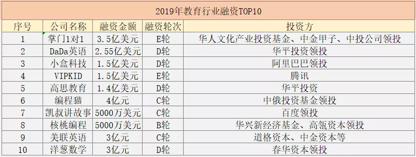 据投中网统计,2019年国内教育行业投融资共305起,其中有36家企业融资金额过亿元,TOP10名单如下: