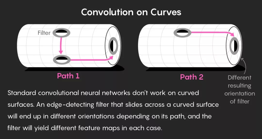 想象一下设计用于检测简单图案的过滤器:深色斑点在左,浅色在右。在平面网格上下左右滑动它,它将始终保持右边朝上。但是,即使在球体的表面上,这种情况也会改变。