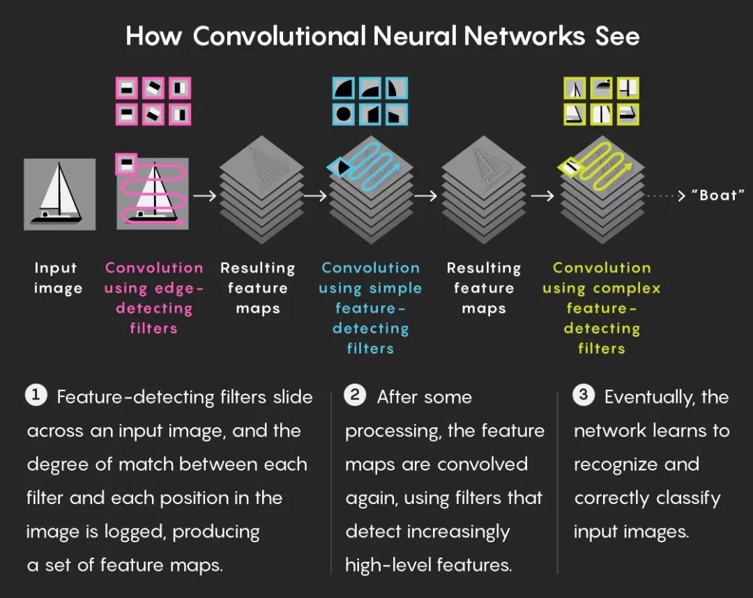“基本上可以将卷积视为滑动的窗口,” Bronstein解释说。卷积神经网络将许多这些“窗口”滑动到数据上,例如过滤器,每一个都旨在检测数据中的某种模式。如果是猫的照片,经过训练的CNN可能会使用过滤器来检测原始输入像素中的低级特征,例如边缘。