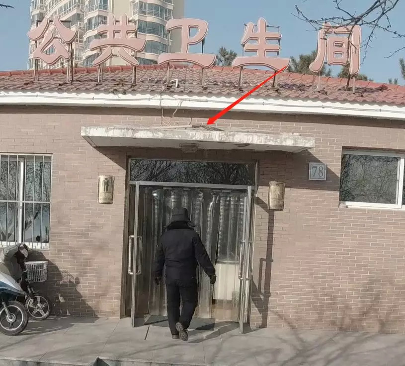 工作人员还告诉我们,怪鸽把他用来敲冰用的棍子藏在了附近的公厕门上方,我俩去看了看发现确实有木棍放在上面。