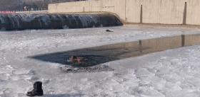 随后他走到了河上,开始破冰层。
