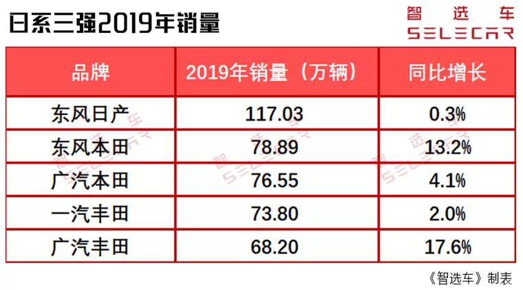 首先我们先来大致了解一下日系三强的2019年销量数据,如果将本田、丰田各自拆分成两个合资公司进行计算,那么东风日产以117.03万辆的销量位列第一;如果单从品牌来看,本田则以合计155.44万辆的成绩位列第一,丰田则以142万辆的成绩位列第二;另外,广汽丰田实现17.6%的销量增长率实属不易。