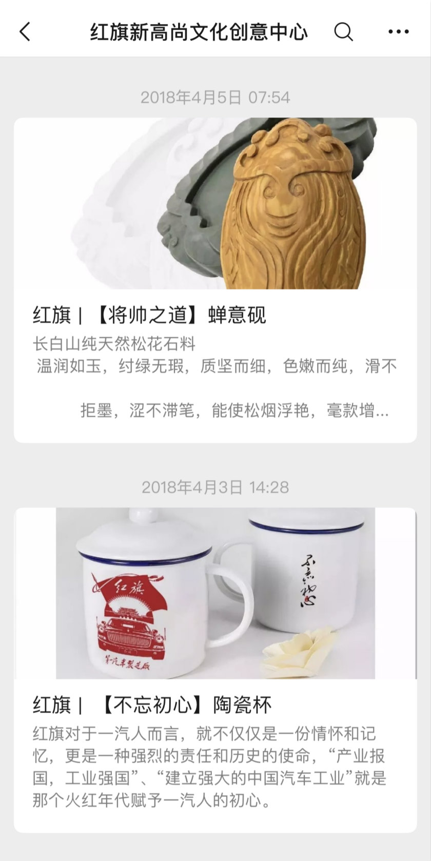 事实上红旗旗下的文创产品还有很多,且基本都没有公开发售。2018年,红旗成立了一个名为“红旗新高尚文化中心”的部门,在同名微信公众号上默默地宣传起了自家的文化衍生品。这些商品分为文房与商务两大系列,从砚台、书签到钥匙扣、手表包罗万有,在宣传上也着重强调中国文化的元素,但并没有引发广泛关注。