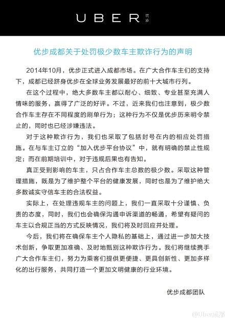 9月21日,优步成都官方微博回应优步成都司机遭遇封号事件称:极少数合作车主存在不同程度的刷单行为,这种行为属优步明令禁止的,已经涉嫌违法,因此对刷单司机采取了包括封号在内的相应处罚措施。