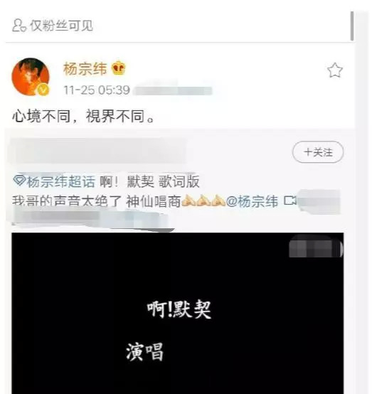 19年的11月25日零点,刘宇宁正式发表了这首《啊默契》,然而几个小时候的凌晨五点,杨宗纬就用自己的账号转发了一条五月份发布的微博,内容是自己演唱同一首歌的音频,并配文:“心境不同,视界不同。”