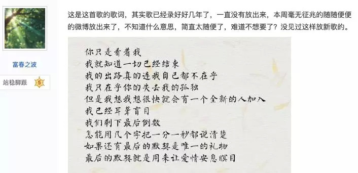 也有粉丝留言表示疑惑,为什么这首歌发的这么仓促:“本周毫无征兆的随随便便的微博放出来了,不知道什么意思,简直太随便了,难道不想要了?没见过这样放新歌的。”