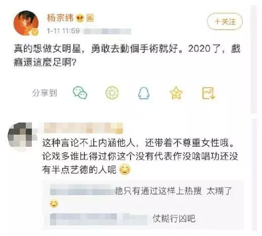 “真的想做女明星,勇敢去动个手术就好。2020了,戏瘾还这么足啊?”