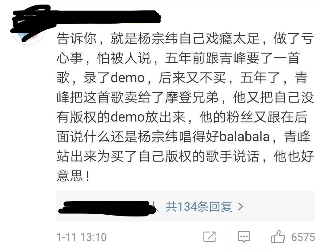 有网友爆料称,五年前杨宗纬跟吴青峰要了这首歌录了demo,但后来又不买了,五年后吴青峰将歌曲卖给刘宇宁,杨宗纬又把自己没有版权的demo放出。