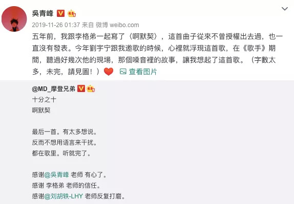 到底谁才有这首歌的版权?想必歌曲原作者吴青峰最清楚,很快,吴青峰也发布了长文,力挺刘宇宁。