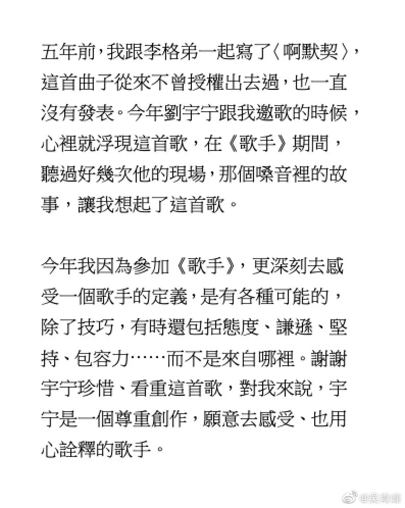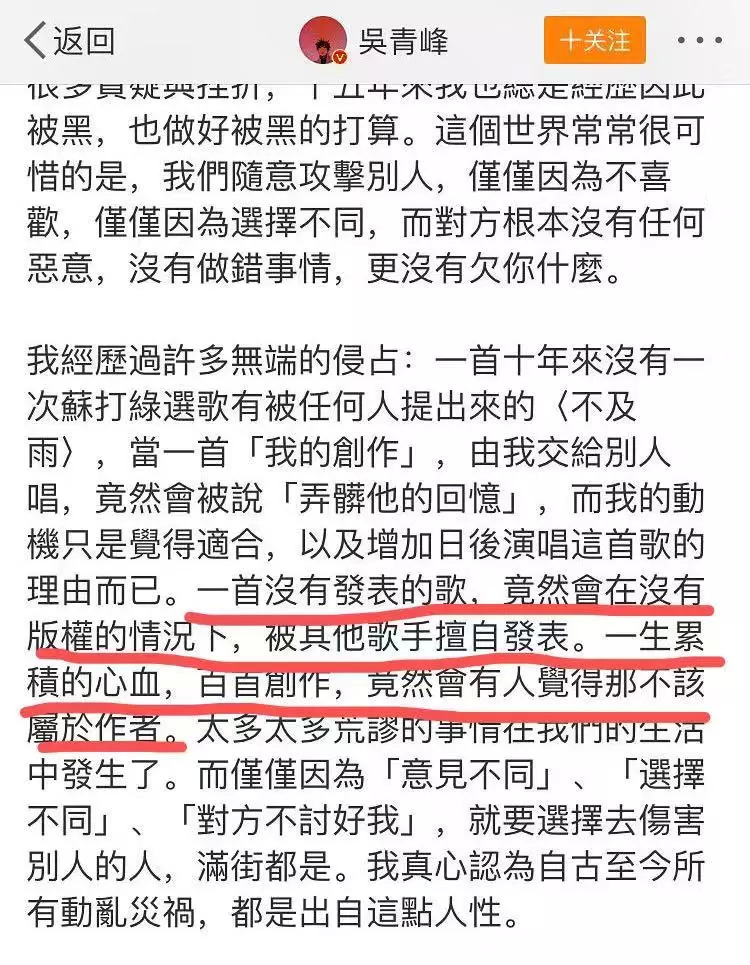 几天后,吴青峰还发长文倾诉自己曾被“无端侵占”的经历:“一首没发表的歌,竟然会在没有版权的情况下,被其他歌手擅自发表。”