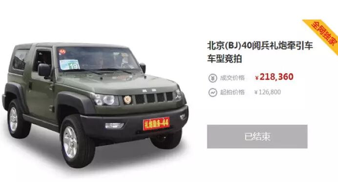 9月18日10时整,北京(BJ)40礼炮牵引车拍卖活动在腾讯汽车商城正式开拍,最终12台竞拍车辆全部成功售出,合计拍得284.502万元,最高成交价达28.738万元。12台竞拍车平均溢价率达87%,最高溢价率超过126%。3天共计1074人次参与竞拍,出价24792次。由于竞拍车辆全部售出,计划于21、22日进行的补拍活动已自动取消。