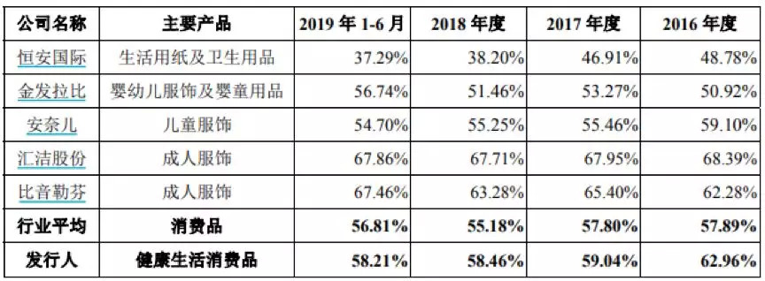 报告期内,健康生活消费品行业内主要企业恒安国际、金发拉比等5家公司的平均毛利率分别为57.89%、57.80%、55.18%和56.81%,稳健医疗的毛利率均高于可比公司平均值。
