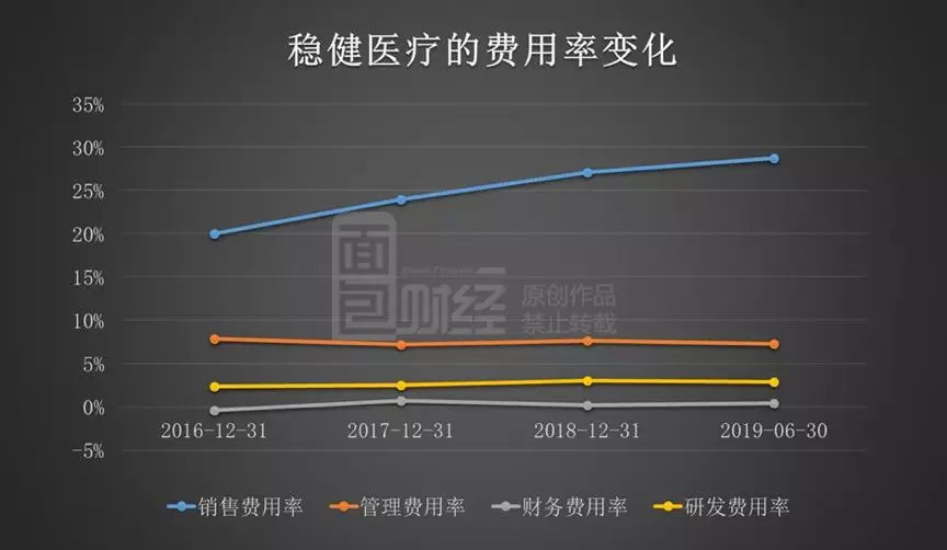 2016年至2019年上半年,公司的期间费用占营业收入的比例分别为27.55%、31.82%、34.79%和36.45%。其中,销售费用率分别为20.02%、23.96%、27.12%和28.77%,维持在较高水平,且保持持续上升的趋势,与期间费用率水平变化保持一致。