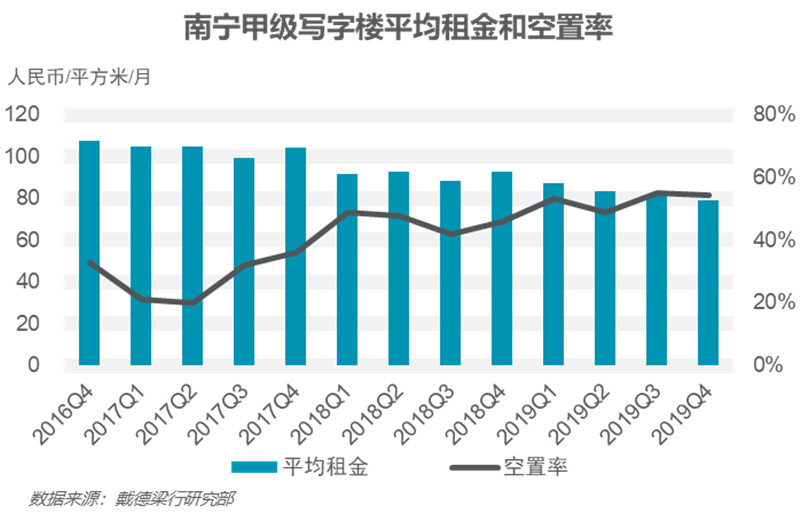 2020年,全市预计还将有82万平方米的供应量陆续入市,市场压力不言而喻。虽然需求的增加最终有赖于经济环境的改善,不过政策刺激也有助于更快的吸引企业进驻,自8月广西自由贸易试验区获批设立以来,南宁片区新增企业逾1300家;12月,广西出台“30条”支持自贸试验区高质量发展,对电子信息、生物医药等主导产业给予税收减免,对总部企业落户予以贡献激励,产业发展的指导政策有望刺激办公市场的需求增加。