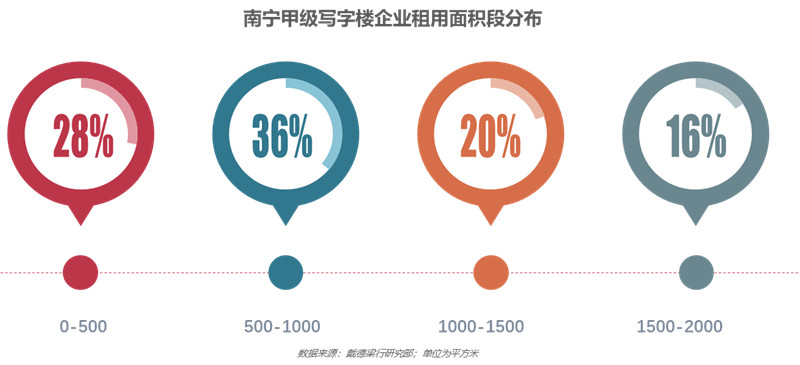 从2019年需求结构来看,在房地产市场热度较高的当下,建筑业与房地产业成为南宁写字楼市场的核心客群,二者租赁成交面积占比分别为32%、25%,相加接近六成;而专业服务业、TMT、金融业则分别占比12%、9%、9%,该行业构成与多数一线城市及重点二线城市相去甚远。未来,作为带动经济发展重要动力的TMT、金融业、专业服务业在南宁仍有着巨大的发展空间。此外,全年租赁成交中鲜见总部企业和外资企业,可见当前南宁商务市场对此类客户的吸引力仍然有限,这也是未来在城市发展、政策支持等的促进下可改善的一大方向,如总部型企业的引进不仅可以大体量去化办公物业,还有助于集聚上下游关联企业,促进产业链的完善。通过企业租用甲级写字楼办公空间面积段分布分析,租用1000平方米(含)及以下甲级写字楼办公空间的企业数量占比达64%,反映了中小型企业是现阶段南宁甲级写字楼租赁市场的主要客群,同时亦有部分大型企业的区域分支租用。