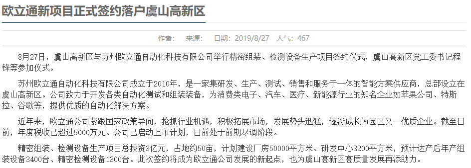 欧立通背后的故事绝不简单。在欧立通的所在地常熟市虞山高新区,其政府网站的新闻显示,公司在2019年8月27日,已经启动了上市计划,而仅过了三个月,计划就赶不上变化了,公司匆匆要被并购。更加惊人的是,这家去年7352万元利润的公司,还是纳税“模范”,年度税收已经超过5000万元,推算公司所得税率在40%左右,我国目前高新技术企业的所得税率为15%,公司这么交税是否太积极了?