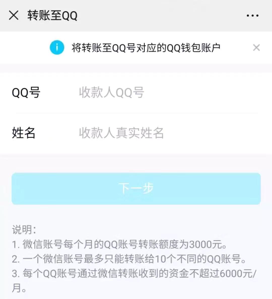 值得注意的是,这项转账功能也有一定的金额与次数限制:单笔转账金额不能超过1000元;单个微信号每月转出金额不能超过3000元;每个QQ号每月接收金额不能超过6000元;每个微信号每月只能向10个QQ号转账。另外,QQ目前不能向微信反向转账。