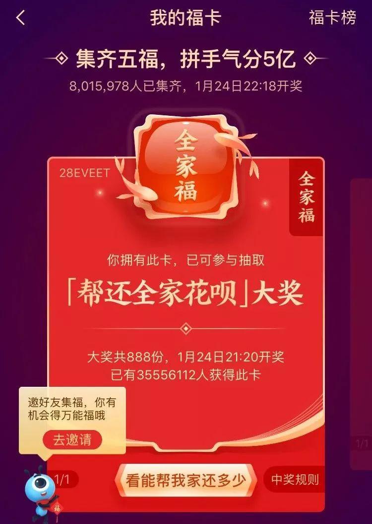 1月9日,就在微信宣布上线红包定制封面开放平台同一天,支付宝五福项目组宣布,2020年春节集五福在1月13日正式启动。此次除了集齐五福瓜分5亿元红包外,去年帮还全年花呗的“花花卡”也将升级为“全家福卡”,中奖权益是“帮全家还全年花呗”。