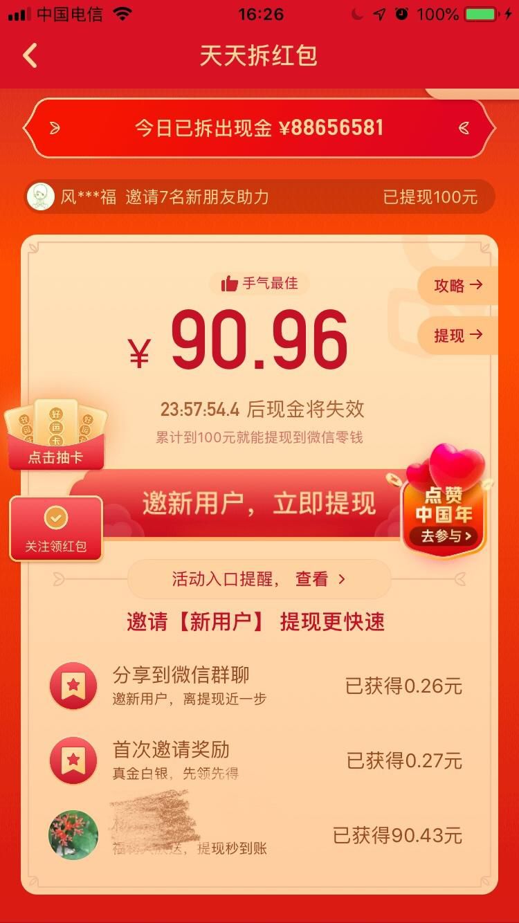值得一提的是,快手为春晚预热的“天天拆红包”活动,与拼多多拉新如出一辙。首先拆出一个90.43的大红包,距离100元的提现看起来很近,但接下来分享到微信群聊提现越来越少,变成0.27,为了凑够100元,需要竭力转发拉新。